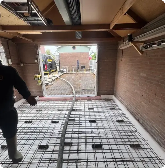 Niet iedere betonvloer garage hoeft hetzelfde te worden afgewerkt. Wilt u vooral een stevige vloer waar uw auto veilig op kan staan, dan is ruw afwerken vaak al voldoende. Wij kunnen het beton met een betonpomp aanbrengen en direct vlak afwerken met een all-in service. Wilt u juist een netter en strakker resultaat, dan past een gevlinderde betonvloer beter. Dat komt doordat de toplaag dichter en gladder wordt afgewerkt. Een gevlinderde vloer wordt vaak gekozen wanneer de garage ook als nette hobbyruimte of werkplaats wordt gebruikt.